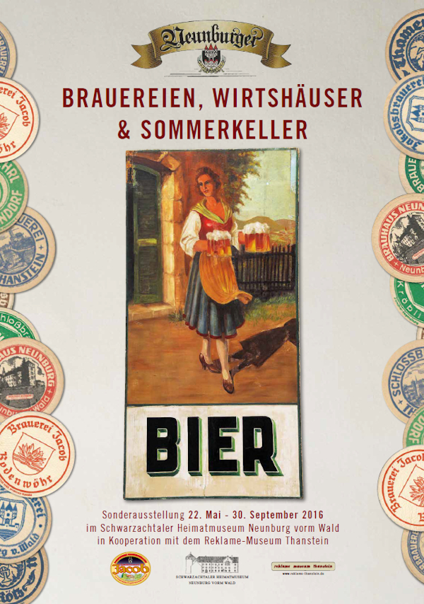 Neunburger Brauereien, Wirtshäuser & Sommerkeller 22. Mai bis 30. September 2016 Schwarzachtaler Heimatmuseum Neunburg vorm Wald Im Berg 12 92431 Neunburg vorm Wald Tel. +49(0)9672 4183 E-Mail: museum-neunburg@gmx.de Internet: www.neunburgvormwald.de/en/leben-in-neunburg/schwarzachtaler-heimatmuseum.html www.reklame-thanstein.de Öffnungszeiten: Sonntag 10 bis 12 und 14 bis 17 Uhr, Mittwoch 14 bis 17 Uhr Besichtigung der Sonderausstellung außerhalb der Öffnungszeiten nach vorheriger Anmeldung möglich Das Schwarzachtaler Heimatmuseum präsentiert ab dem 22. Mai 2016 die Sonderausstellung „Neunburger Brauereien, Wirtshäuser & Sommerkeller“. Mit vielfältigen Exponaten aus dem eigenen Museumsbestand, aus dem Reklame-Museum Thanstein (Sammlung Herbert Männer) und aus privater Hand bietet die Sonderausstellung Informatives zum Bier, Nostalgisches aus der „guten alten Zeit“ und Historisches, so etwa, wenn viele der heute längst verschwundenen Brauereien und Wirtshäuser in Neunburg vorm Wald und Umgebung mit alten Fotografien, Werbetafeln, Maßkrügen, Biergläsern, Bierdeckeln und Etiketten wieder zum Leben erweckt werden. |