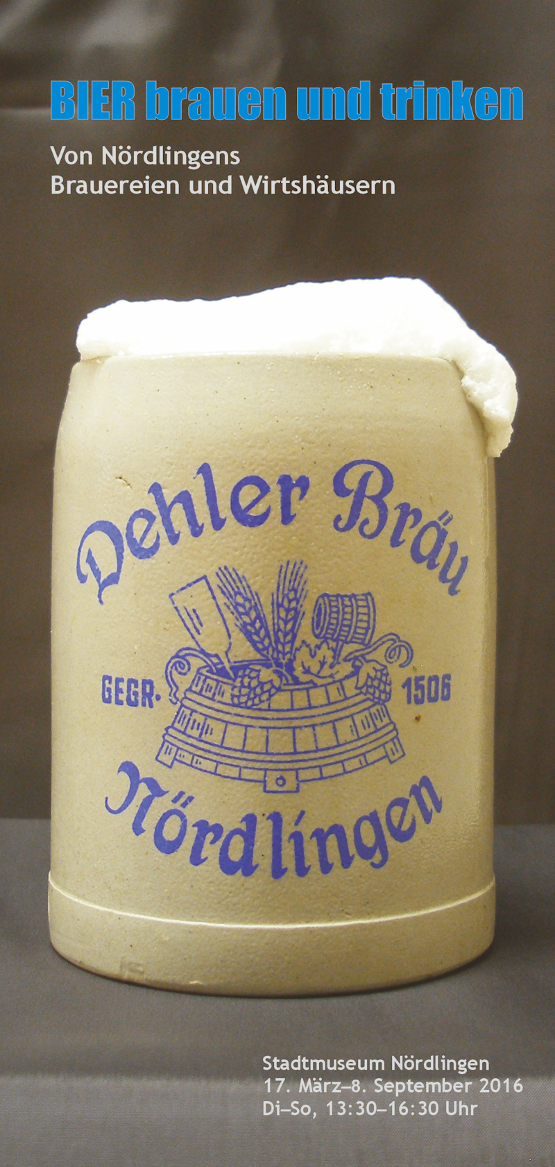 und Wirtshäusern 17. März bis 8. September 2016 Stadtmuseum Nördlingen Vordere Gerbergasse 1 86720 Nördlingen Tel. +49(0)9081 84810 E-Mail: stadtmuseum@noerdlingen.de Internet: www.stadtmuseum-noerdlingen.de Öffnungszeiten: Dienstag bis Sonntag 13.30 bis 16.30 Uhr Führungen jederzeit nach tel. Anmeldung, Kosten: 35 € zzgl. Eintritt/Person Eintritt: Erwachsene 4,50 €, Senioren 3 €, Studenten/Schwerbehinderte 2,50 €, Schüler/Kinder über 6 Jahre 1,50 €, Familie 9,50 € Vor 500 Jahren wurde das bayerische Reinheitsgebot erlassen. Aus diesem Anlass blickt das Stadtmuseum auf die lange Geschichte des Biers und der Gasthäuser in Nördlingen. Schon keltische und römische Funde aus dem Stadtgebiet weisen auf den Konsum von Gerstenbier hin. Auch der Stadtteil „Hopfengarten“ liefert einen Hinweis auf den Anbau einer der Grundzutaten für Bier in Nördlingen. Mit dem Ungeld, das König Ludwig 1327 auf Wein und Bier erheben lässt, um damit eine neue Stadtmauer zu errichten, erscheint der Bierkonsum als Wachstumsmotor. Im Stadtmuseum bildet das Bräuhaus des Spitals von 1534 das Portal in eine Ausstellung, in der vergangene Brau- und Wirtshauskultur Nördlingens mit zahlreichen privaten Leihgaben fotografisch und filmisch lebendig wird. |