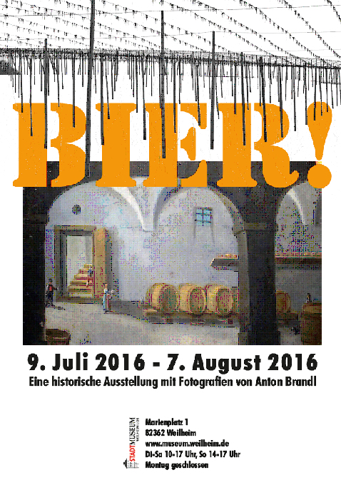 Anton Brandl 9. Juli bis 7. August 2016 Stadtmuseum Weilheim Marienplatz 1 82362 Weilheim Internet: www.museum.weilheim.de Öffnungszeiten: Dienstag bis Samstag 10 bis 17 Uhr, Sonntag 14 bis 17 Uhr Die bayerischen Herzöge Wilhelm IV. und Ludwig X. hatten im Jahre 1516 veranlasst, dass allein Malz, Hopfen und Wasser als Zutaten zum Bierbrauen verwendet werden dürfen. Dieses als Reinheitsgebot bekannt gewordene, älteste noch gültige Lebensmittelgesetz der Welt, feiert in diesem Jahr seinen 500. Geburtstag. Auch das Stadtmuseum Weilheim widmet daher dem Thema Bier eine Ausstellung. Getreu dem Motto des Museums „Alte Meister – Junge Kunst“ werden in dieser Ausstellung historische Objekte zur Geschichte der Weilheimer Brauereien und Gasthäuser den zeitgenössischen Fotografien des Münchner Fotografen Anton Brandl gegenübergestellt. Die Fotoserie „Hallertau“ von Anton Brandl entstand in den Hopfenanbaugebieten der nördlich von München gelegenen Hallertau und von dort bezogen über lange Zeit auch die Weilheimer Brauer ihren Hopfen. Kunst- und Alltagsgegenstände zur „Weilheimer Biergeschichte“ erinnern an die Zeit, als in Weilheim noch bis zu 27 Braumeister brauten und in ihren Wirtshäusern ihr Bier ausschenkten. |