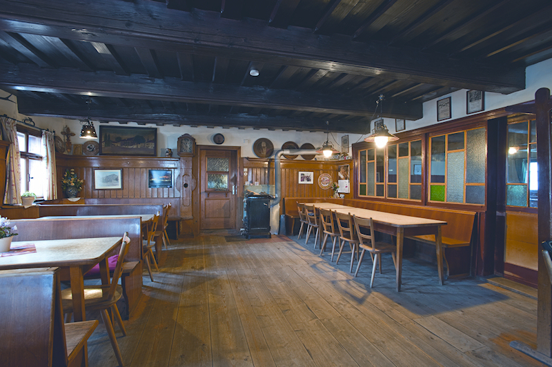 Höhepunkte der historischen Ausstattung der Gaststube sind zweifellos die nahezu schwarze, von mehreren Unterzügen getragene Holzbalkendecke des 18. Jahrhunderts sowie die neben der Küchentüre platzierte frühbiedermeierliche Standuhr, die wohl schon 1793 hier in der Gaststube aufgestellt wurde. Die halbhohe Wandvertäfelung, das Gläserbuffet sowie nahezu das gesamte Mobiliar stammen aus der letzten umfassenden Modernisierungsphase in den Jahren 1952/53, tragen jedoch in ihrer der alten Stube angepassten Einheitlichkeit maßgeblich zum authentischen Ambiente bei. Auch der Schankeinbau im Jahr 2000 durch die Löwenbrauerei Passau sowie die Erneuerung des Dielenbodens durch die Familie (zum Glück wieder in Holz, man stelle sich in dieser Umgebung einen Fliesenboden vor!) wurden mit viel Gespür und größter Behutsamkeit vorgenommen.