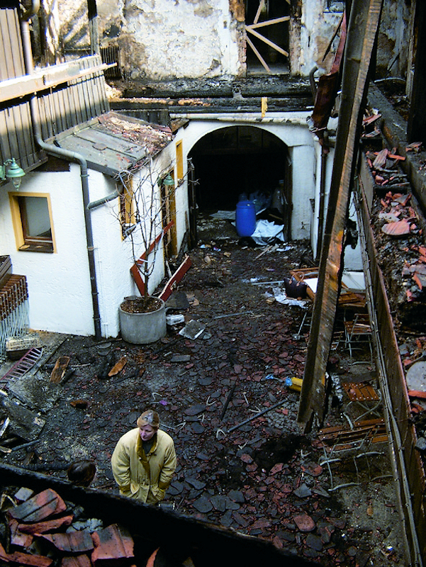Die eben genannte Wiedereröffnung war deshalb unumgänglich geworden, weil ein Großbrand am 7. März 2004 dem Betrieb ein Ende bereitet hatte. Der Sonderbericht der Feuerwehr schildert den Einsatz von 70 Feuerwehrdienstleistenden, 2 Kdow, 2 LF 16/12, 1 DLK 23/12, 1 DLK 18/12, 1 TLF 16/25, 2 LF 16-TS, 1 LF 8/6, 1 KLF, 1 WLF, ABSLM, 1 Klaf, 1 V-LKW, 1 MZF, 12 Pressluftatmern, 2 Wenderohren,1 B-Rohr, 1 C-Rohr, 910 Meter B-Schlauch, 630 Meter C-Schlauch, 3 Steckleitern, einer Schiebeleiter und so fort. Die Feuerwehren aus Ammersricht und Karmensölden rückten zur Verstärkung an. Das Wasser der Vils reichte, das Feuer erlosch. Schwer beschädigt lag jetzt das Anwesen Nabburgerstraße 8 da.