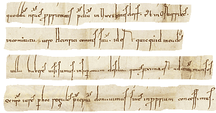 Die Beschreibung des eigentlichen rechtlichen Vorgangs nimmt nur einen kleinen Teil der Urkunde ein. Da es keine vermessenen Grenzen gab, wurde der verschenkte Besitzkomplex oft mit "in der Grafschaft des N.N." umschrieben. Die Größenangabe "Mansen" bezeichnet eine Bauernstelle. Durch die Erneuerung von Schenkungen seiner Vorgänger erzeugt der neue König Kontinuität und legitimiert sich als Nachfolger.