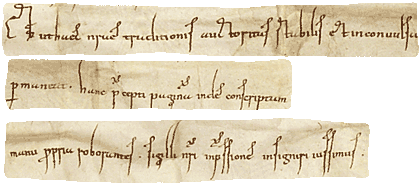 Et ut haec nostrae traditionis auctoritas stabilis et inconvulsa permaneat, hanc praecepti paginam inde conscriptam manu propria roborantes sigilli nostri inpressione insigniri iussimus.