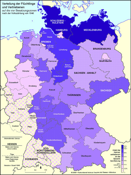 Verteilung der Flüchtlinge und Vertriebenen auf die Besatzungszonen, 1946 (© 2000 Kartendienst Andreas Toscano del Banner, München, Quelle: Bayerisches Statistisches Landesamt)