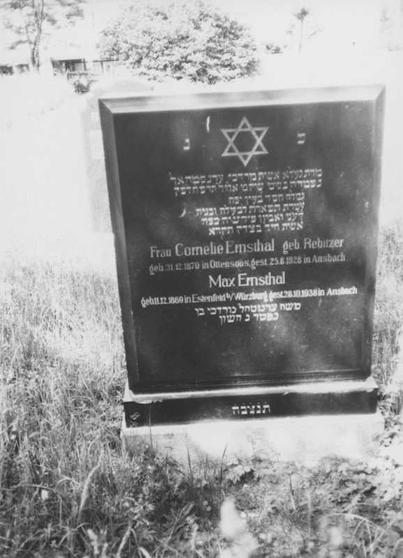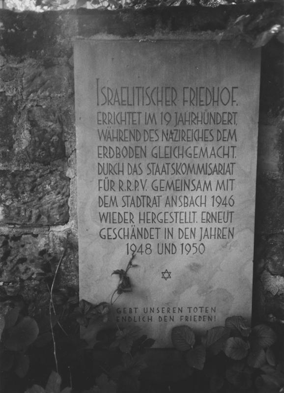 | Schändungen: Spuren ehemaliger Schändungen sind noch heute sichtbar. In Verbindung mit dem Novemberpogrom 1938 wurde das Tahara-Haus am Friedhof stark beschädigt und 1944 durch die Stadt abgetragen. Ein Gedenkstein an der südlichen Einfriedungsmauer trägt die Inschrift: „Israelitischer Friedhof, errichtet im 19. Jahrhundert, während des Nazireiches dem Erdboden gleichgemacht, durch das Staatssekretariat für R. R. P. V. gemeinsam mit dem Stadtrat Ansbach 1946 wieder hergestellt, erneut geschändet in den Jahren 1948 und 1950. Gebt unseren Toten endlich den Frieden! [RRPV: Rassisch, Religiös und Politisch Verfolgte]. |