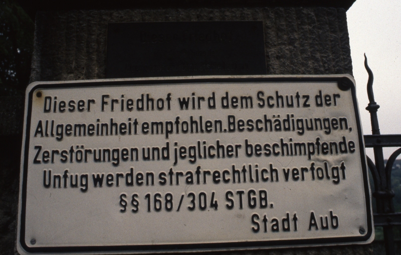 | Alter: Um 1630 vor der Stadtmauer am Harbachweg eingerichtet. Der erste Vermerk im Memorbuch von Aub nennt die 1631 verstorbene Rabbinersgattin Jutta als zweite Person, die auf dem Friedhof beigesetzt wurde. Aus unbekannten Gründen brachte man, so das Memorbuch, die Verstorbenen von 1665 bis 1695 zu Friedhöfen der Umgebung wie Allersheim, Eibelstadt, Rödelsee und Laudenbach (bei Karlstadt). Erst seit 1700 fanden wieder regelmäßig Beerdigungen in Aub statt. 1880 legte man einen neuen Friedhof neben der älteren Anlage an und mauerte etwa vierzig Grabsteine des 17. Jahrhunderts aus dem alten Friedhof in die westliche Umfassungsmauer ein. |
