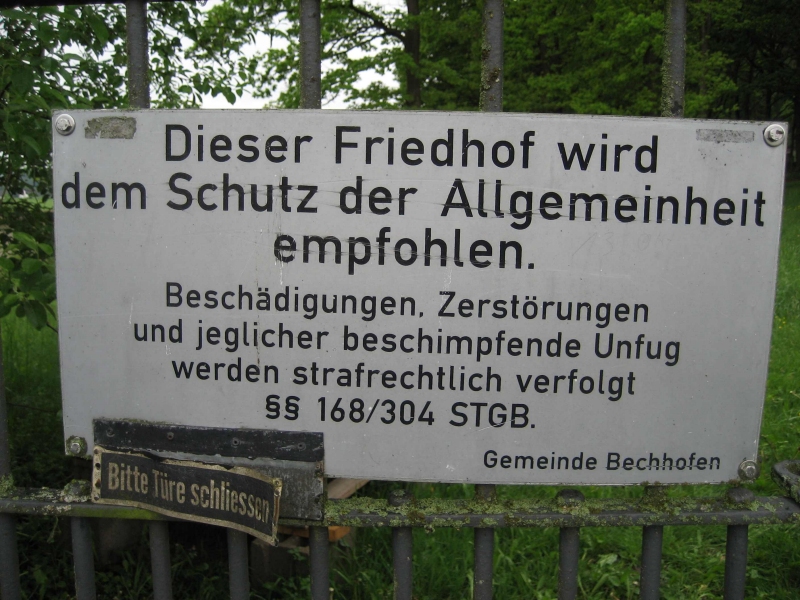 | Größe: 16510 qm; Bechhofen ist einer der größten jüdischen Friedhöfe Bayerns. Massive Steinmauer rund um den Friedhof, eisernes Haupttor rechts der Straße; dahinter befindet sich ein altes steinernes Wasserbecken. |