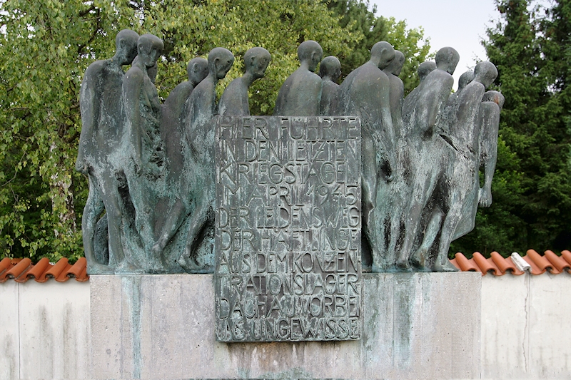 den Völkermord an den Juden. Besondere Bedeutung hat das 1989 auf Initiative von Bürgermeister Ekkehard Knobloch errichtete Denkmal außen an der Friedhofsmauer, das an den so Todesmarsch der Häftlinge aus dem Konzentrationslager Dachau erinnert, die 1945, kurz vor Kriegsende, von SS-Männern durch das Würmtal nach Süden getrieben wurden. Die von Hubertus v. Pilgram geschaffene Metallskulptur zeigt wankende, ausgemergelte Gestalten auf einem Sichtbetonsockel. Eine Reihe gleicher Denkmäler zeichnet den Weg der Häftlinge von Dachau über München nach Waakirchen nach. Nicht mehr vorhanden ist ein 1995 anlässlich der 50. Wiederkehr des Todesmarsches von den Künstlern Axel Wagner und Thomas Heyl vor dem Rathaus und vor dem Eingangstor zum jüdischen Friedhof aufgestelltes Denkmal, bestehend aus einem zweigeteilten Mühlrad, das auf das Spannungsfeld von Vergangenheit und Gegenwart, Fragen und (Ver-)Antworten hinweisen sollte. |