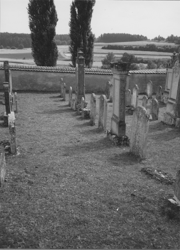 | Beerdigungen: Insgesamt 291 Beerdigungen, die letzte 1939. 272, teils recht alte Grabsteine sind erhalten, darunter auch die der Verwandten der Schauspielerin Therese Giehse. Besonderheiten: Errichtung eines Tahara-Haus 1851 nach den Plänen des Hainsfarther Maurermeisters Hasenmüller (heute bewohnt). Nördlich des Leichenhauses entstand wenige Jahre später eine „Wagenremise“ zur Unterbringung des Leichenwagens. |