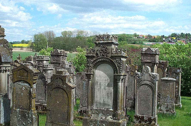 | Beerdigungen: Im 15. Jahrhundert brachten die Oettinger Juden ihre Toten nach Nördlingen, später nach Wallerstein. Nach einer neueren Zählung sind 319 Grabsteine erhalten, davon 36 über Kindergräbern (links des zweiten T�rchens). Rechts und links des Weges sehr viele alte und kunstvolle Grabsteine, alle konsequent gegen Osten hebräisch, gegen Westen deutsch beschriftet. |