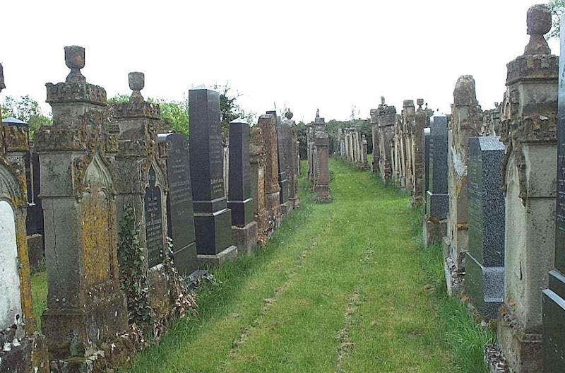 | Größe: 2420 qm; massive hohe Mauer rund um den Friedhof; in der rechten Ecke an der Straße kleines Tor (Eingang zur Wohnung), links daneben großes Eisentor mit zwei Davidsternen. Heute L-fürmige Friedhofsfläche. |