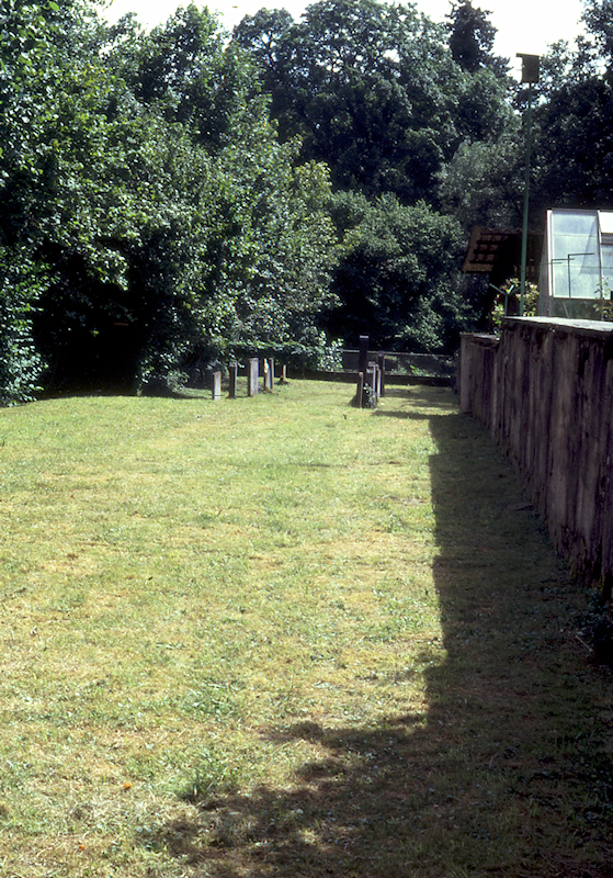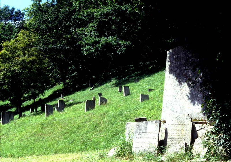 | Alter: Friedhof rechts der Straße (stadtausw�rts) aus dem 14. Jahrhundert (?). Juden in Pappenheim sind 1314 und 1330 bezeugt; ob es sich beim mittelalterlichen Friedhof um den alten Teil des heutigen Geländes handelt, kann nicht mit Sicherheit entschieden werden. Beisetzungen führte man nachweislich seit 1579 durch. |