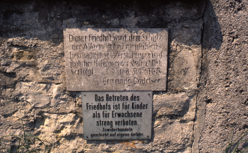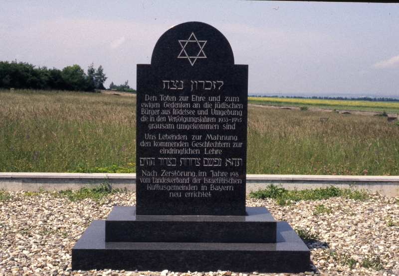 | Besonderheiten: Das bauf�llige Tahara-Haus konnte durch eine Spende von Julius Klugmann und seiner Frau Fr�nzi aus New York, die aus Wiesenbronn stammten, neu errichtet werden; es musste trotz einer späteren Renovierung 1950 abgerissen werden. Der Tahara-Stein (Waschstein für die Leiche) wurde damals mit einer Inschrift versehen und 1980 als Gedenkstein aufgestellt, jedoch 1981 von unbekannten Tätern zerstört. Das gleiche Schicksal erlitt in den 1980er Jahren das Denkmal für die Gefallenen des Ersten Weltkriegs, das aber neu errichtet wurde. 1983 stellt man einen neuen Gedenkstein für die während der NS-Diktatur ermordeten Juden aus Rödelsee und Umgebung auf. In Rödelsee existierte eine 1705 gegründete Chewra Kaddischa, der 18 Mitglieder angehörten, darunter auch Personen aus anderen Gemeinden. |