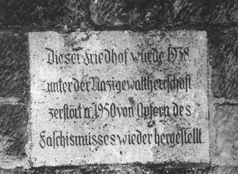 | Schändungen: 1938. An die Schändung erinnert ein in der Mitte des Friedhofs auf einem gemauerten Sockel stehendes Denkmal: „Dieser Friedhof wurde 1938 unter der Naziherrschaft zerstört, 1950 von den Opfern des Faschismus wiederhergestellt“. Während des Naziregimes wurde auch das Tahara-Haus zerstört. |