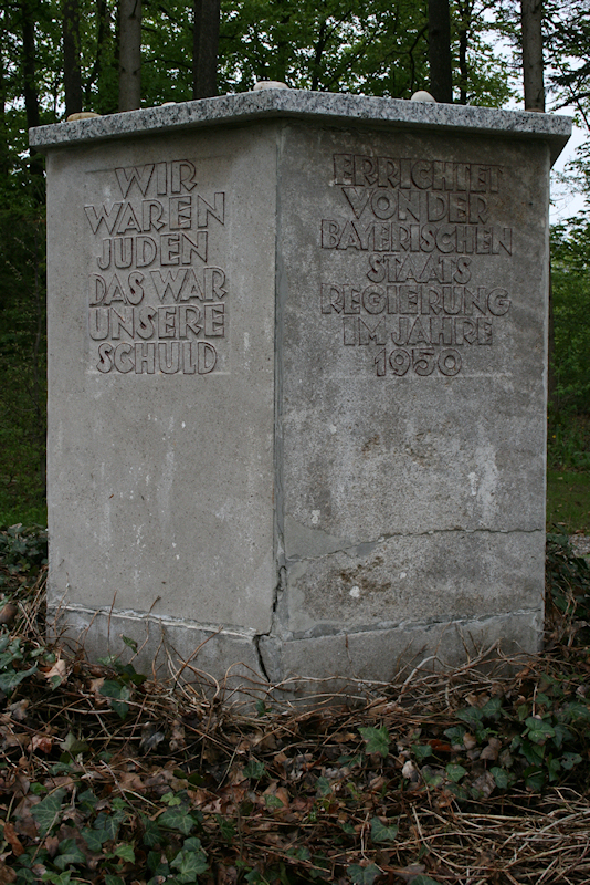 Der Gedenkort liegt im Wald am Ufer des Lechs. über einem Massengrab mit einer unbekannten Zahl von Toten steht ein Gedenkstein in einem gemauerten, mit Dauerbepflanzung versehenen Davidstern. Die Inschrift lautet: „Wir waren Juden / das war unsere Schuld. Errichtet von der Bayerischen Staatsregierung im Jahre 1956."