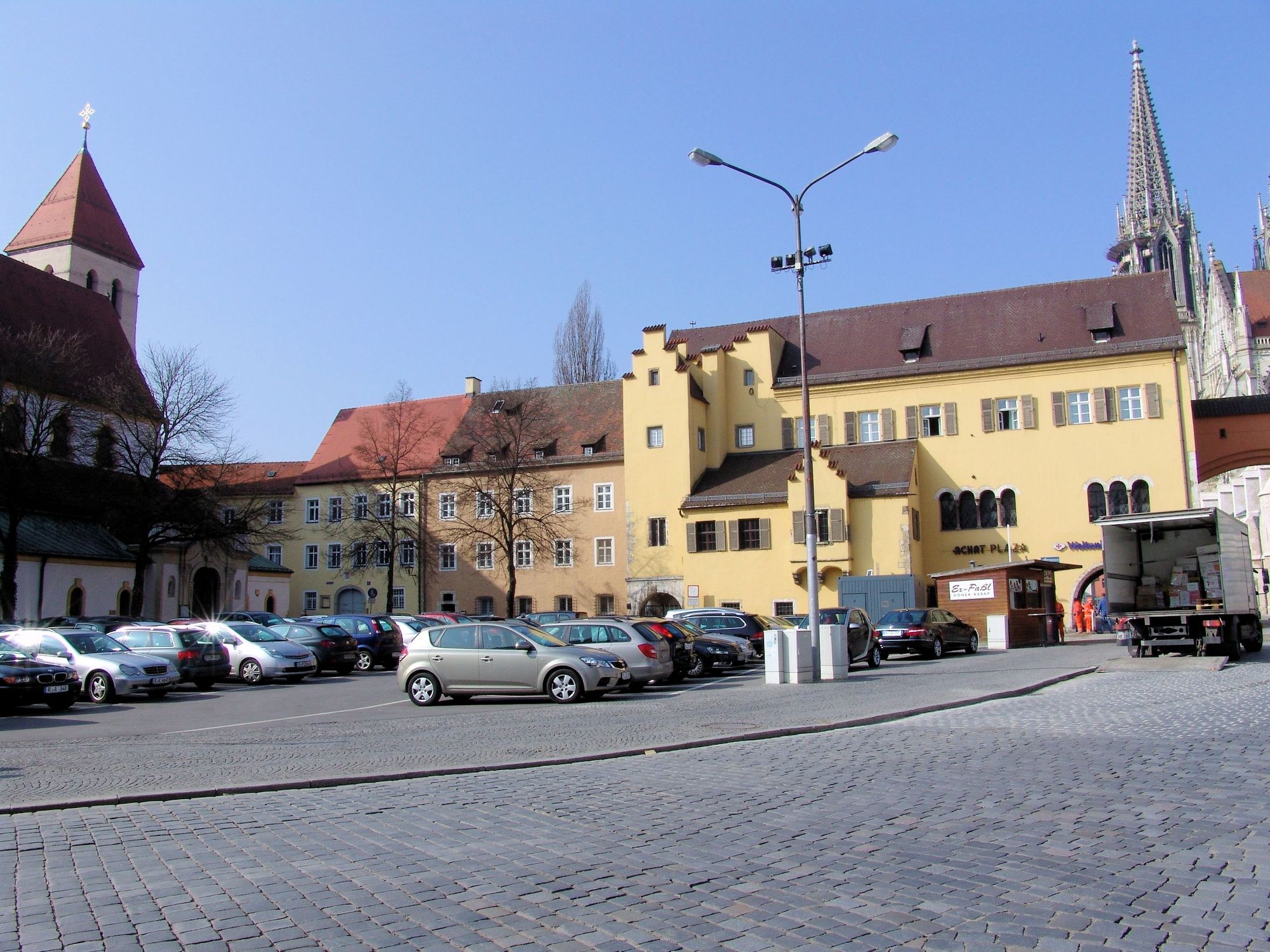 Regensburg ist eine römische Gründung; im 5. Jahrhundert nach Christus gaben die Römer das Militärlager auf. Doch die mächtigen Mauern boten den Bewohnern weiterhin Schutz – auch den ersten bayerischen Herzögen. Ihr Herrschaftssitz, die sogenannte Pfalz, befand sich vermutlich hier auf dem Alten Kornmarkt. Und diese Stelle blieb über Jahrhunderte im Besitz der bayerischen Herzöge. Wenn Sie nach Westen in Richtung Dom blicken, sehen Sie sie linker Hand vor Ihnen den gelben Gebäudekomplex. Ende des 12. Jahrhunderts wurde diese Anlage zu einer bayerischen Herzogspfalz ausgebaut. Dann allerdings geschah etwas, das die Herzöge nicht vorausgesehen hatten: Regensburg wurde eine freie Reichstadt. Jetzt hatte nicht mehr der bayerische Herzog das Sagen, sondern die Stadt verwaltete sich selbst, sie war nur mehr dem Kaiser untertan. Trotzdem blieben viele herzogliche Rechte bestehen, auf die auch Ludwig der Bayer als Herzog pochte. Und auch das Gebäude der einstigen Pfalz blieb immer bayerisch. Freilich – bei seinen zahlreichen Aufenthalten in der Stadt war dem Kaiser dieses Gebäude zu gering. Wenn er in Regensburg war, stieg er bei Patrizierfamilien wie den Auer oder den Gumprecht ab – und ersparte sich damit auch, sein Gefolge auf eigene Kosten unterbringen und verpflegen zu müssen. Dafür kamen die Gastfamilien auf.