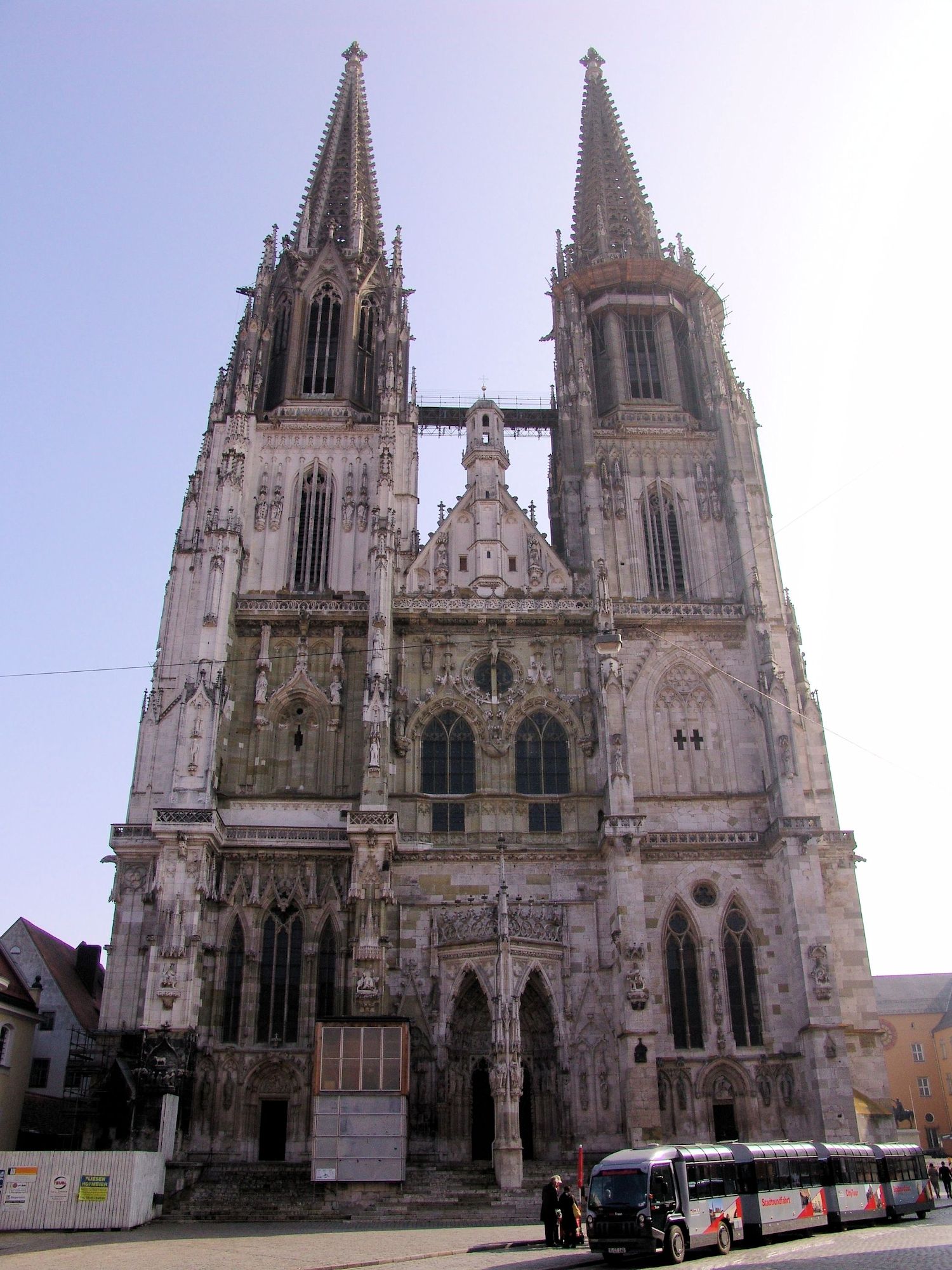 Sie stehen jetzt vor dem Regensburger Dom. In Ihrem Rücken befindet sich ein Denkmal für den bayerischen König Ludwig I., der im 19. Jahrhundert die Domtürme fertigbauen ließ. Das Christentum war schon mit den Römern nach Regensburg gelangt. Im 8. Jahrhundert gründete der heilige Bonifatius das Bistum Regensburg. Seit dem 10. Jahrhundert ist eine Peterskirche im heutigen Dombereich nachweisbar.