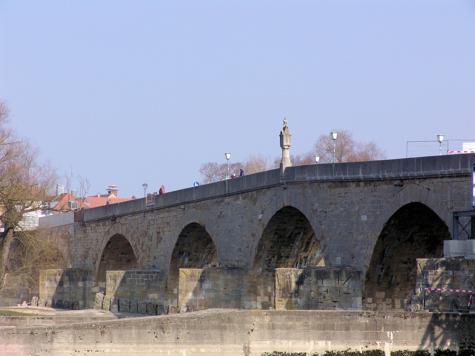 Sie stehen nun an der Steinernen Brücke. Im ersten Moment klingt ihr Name recht einfallslos. Aber man muss wissen, dass dies etwas ganz Besonderes war, denn lange Zeit gab es nur Brücken aus Holz. Die Regensburger Steinerne Brücke ist die die älteste Steinbrücke weit und breit. Sie war auch Vorbild für die viel später erbaute Karlsbrücke in Prag.