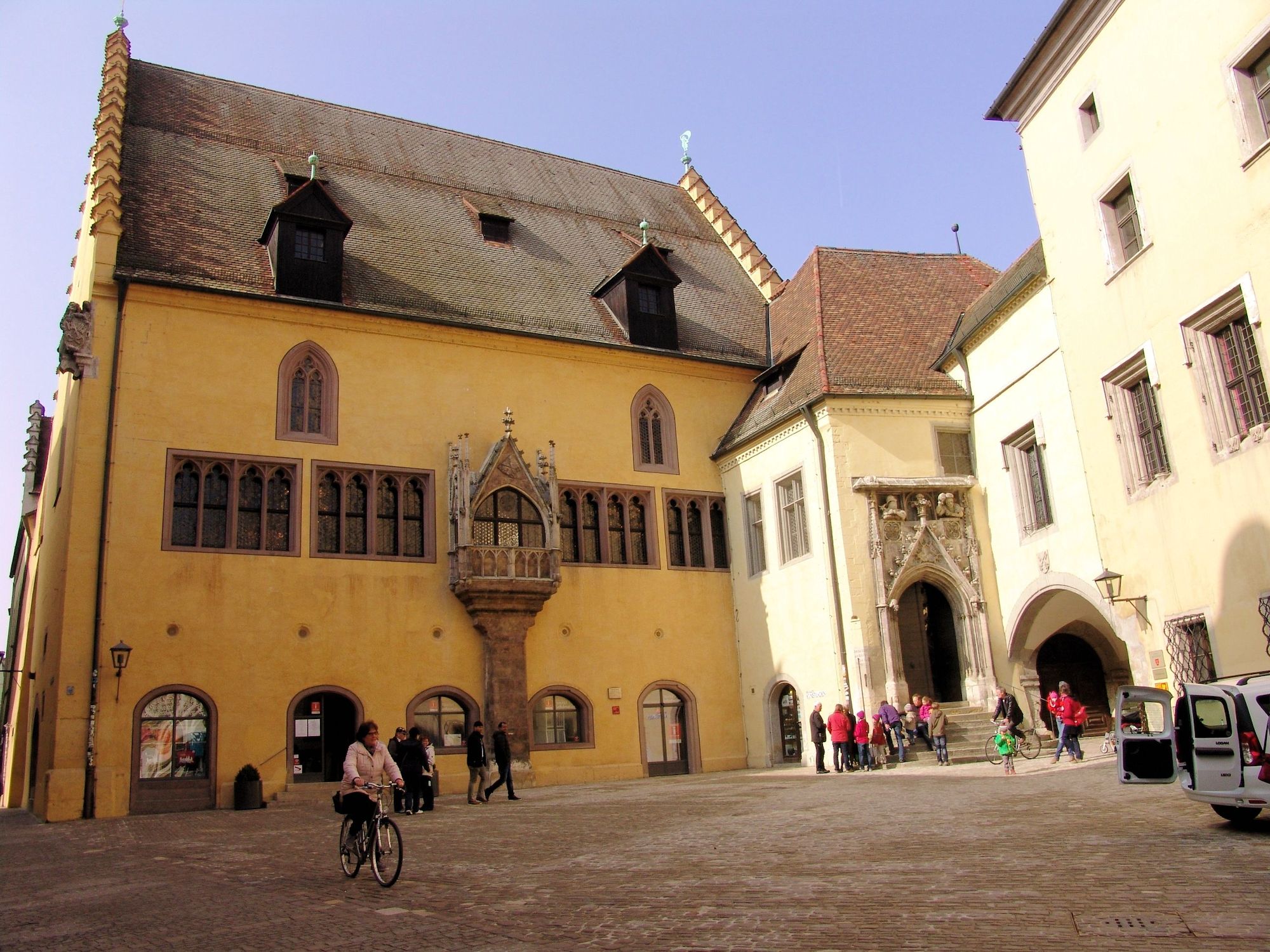 Sie stehen nun vor dem Alten Rathaus. Links sehen Sie den Reichssaalbau, daneben die steile Treppe, die zum mächtigen gotischen Portal führt, rechts den Rathausturm.