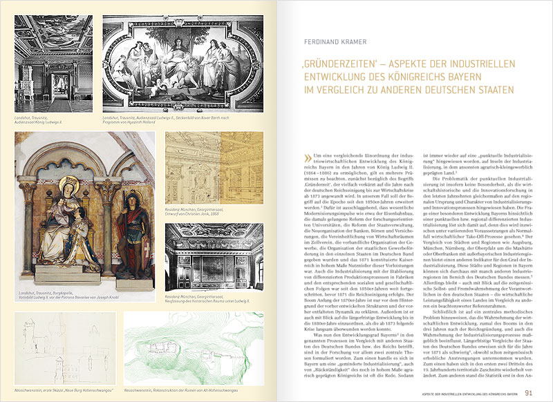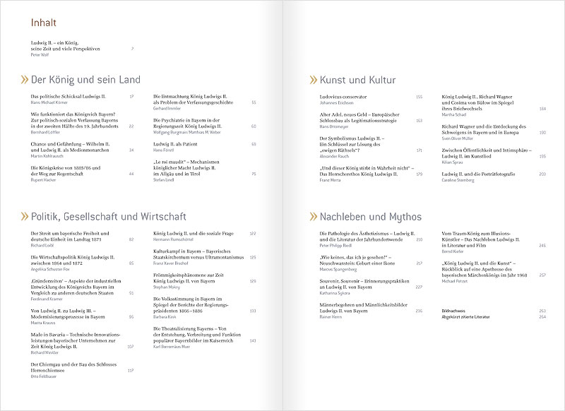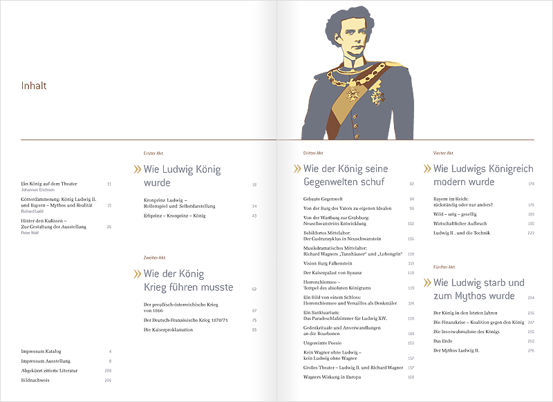 Hg. vom Haus der Bayerischen Geschichte (Veröffentlichungen zur Bayerischen Geschichte und Kultur 60), 978-3-937974-29-3, 304 S., ca. 250 Abb. Erhältlich in der Ausstellung oder beim Haus der Bayerischen Geschichte (0821 3295-0 oder im Online-Shop, € 18 + Versandkosten, Paket und Aufsatzband: 30,- + Versandkosten). Die Buchhandelsausgabe erscheint im Primusverlag (€ 29,90 Einführungspreis bis 31.12.2011, später 34,90; Paket Katalog und Aufsatzband: 39,90 bzw. 49,40) Der Katalog zur Bayerischen Landesausstellung 2011 zeichnet die Umbruchszeit, in der Ludwig II. herrschte, in einem gleichsam fünfaktigen Drama nach: 1. Akt: Wie Ludwig König wurde, 2. Akt: Wie Ludwig Krieg führen musste; 3. Akt: Wie der König einen Kaiser über sich gesetzt bekam; 4. Akt: Wie Ludwig als König im Industriezeitalter herrschte, 5. Akt: Wie Ludwig ein Mythos wurde. Der reich bebilderte Katalog stellt die Exponate jeweils mit Text und Bild vor. |